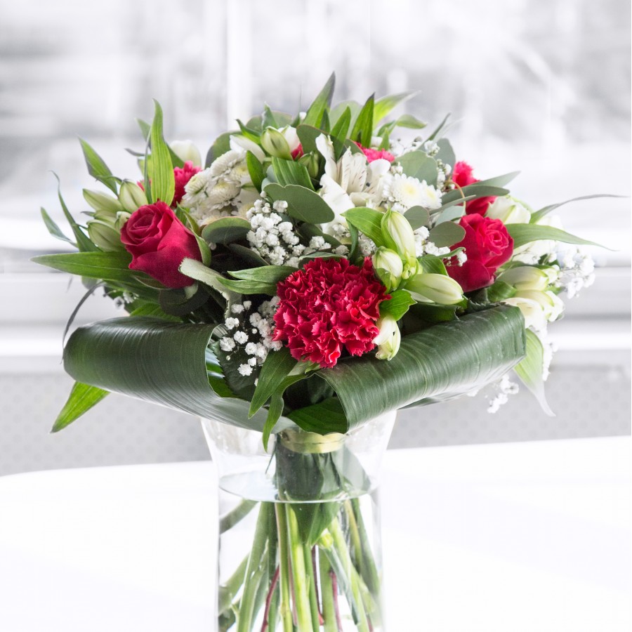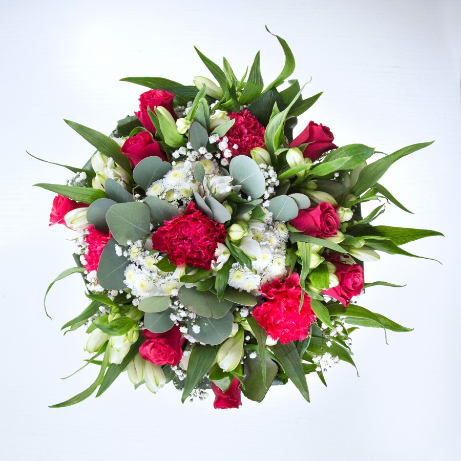 Embrace the radiant beauty of our Radiant Beauty Bouquet. This captivating arrangement features sweet white chrysanthemums and gypsophila paired with luxurious red roses and carnations, elegantly arranged with white alstroemeria and aspidistra leaves.