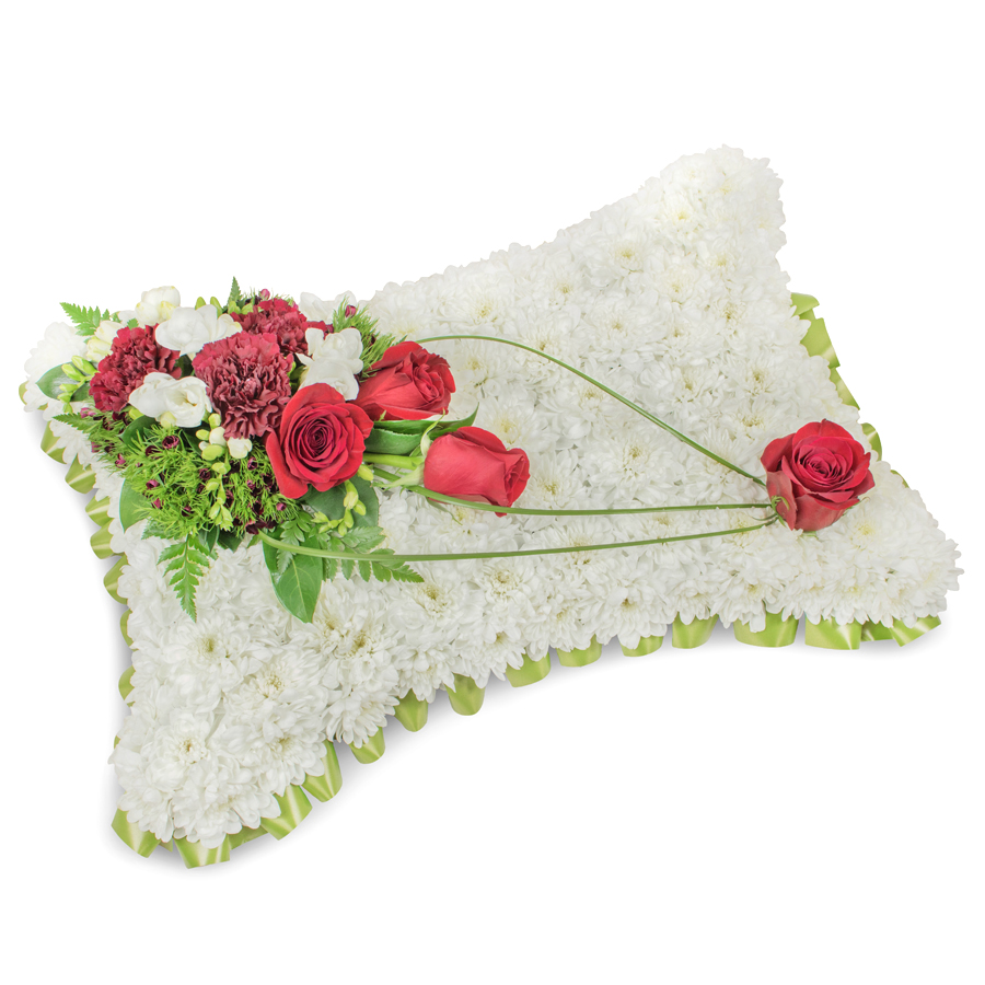Show your support with our exquisite sympathy bouquet, featuring a vibrant mix of white chrysanthemums, red roses, white freesias, and dark red carnations. Each flower is hand-selected for its freshness and arranged with dianthus and bear grass to ensure a unique and elegant design.